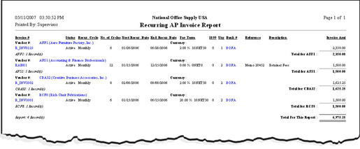 The Recurring AP Invoice Report provides information on the recurring invoice templates that are set up in AccountMate. This report is useful in identifying the vendors for whom these recurring invoice templates are set up and in reviewing the templates' other important details.