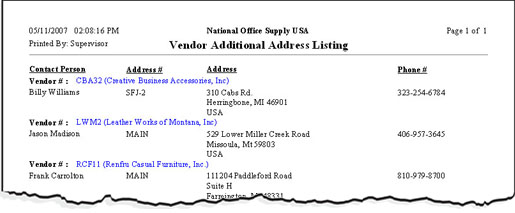 The Vendor Additional Address Listing shows additional vendor addresses other than the main address shown in the Information Tab of the vendor's record. These additional vendor addresses are set up through the Vendor Address Maintenance window. This report supplements the vendor contact information in the Vendor Listing.