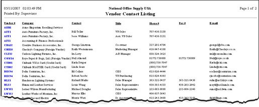 The Vendor Contact Listing shows vendor contact information. It serves as a quick reference list of your vendor contacts. This report is useful in identifying the vendor contact persons to communicate with and when mass mailings to vendor contacts.