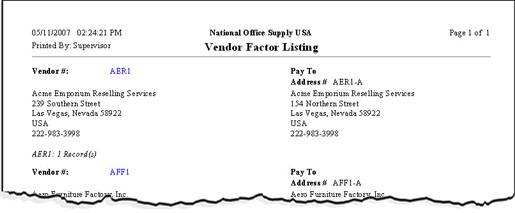 The Vendor Reports help you focus on a variety of vendor-related data and provide pertinent information on your vendors including the applicable credit limits, discount rates, contacts, vendor addresses, vendor factors, and General Ledger distribution accounts.