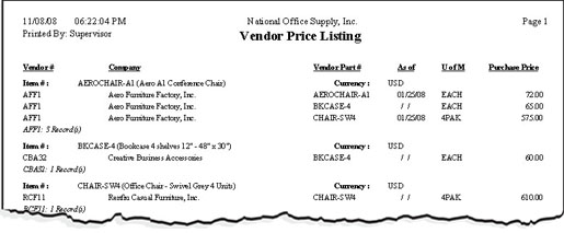 The Vendor Price Listing provides information on specific inventory items each vendor can supply and the price the vendor charges for each item. The report lists the items each vendor supplies and the items' prices in the vendor's currency. This report is useful for reviewing the completeness of the recorded vendor-part information and as a reference for determining the inventory items supplied by a particular vendor.