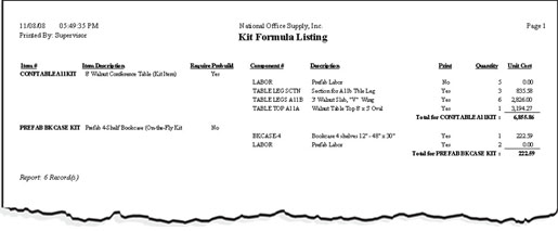 The Kit Formula Listing report provides information about the component items which are needed to build a kit inventory item as well as the quantity and description of each component item. This report may include a kit inventory item that requires prebuilding or not.