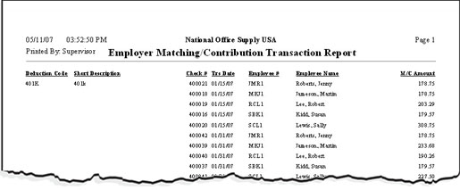 Generate the Employer Matching/Contribution Transaction Report to view the details of the employer match/contribution amount for each applicable deduction from the employees' earnings. Depending upon the sorting options selected, this report provides information on the total employer match/contribution for each deduction code, employee or applicable pay check. This report helps you verify the accuracy of recorded employer match/contribution for each deduction from the employee's pay check and reconcile the total employer contribution by deduction code or by employee.