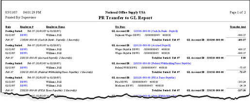 The GL Transfer Report provides an essential audit trail for data transferred to the General Ledger module. This report can also be used to verify the system-generated journal entries after recording payroll transactions, and helps determine the cause for an out-of-balance scenario when closing the period or transferring data to the General Ledger.