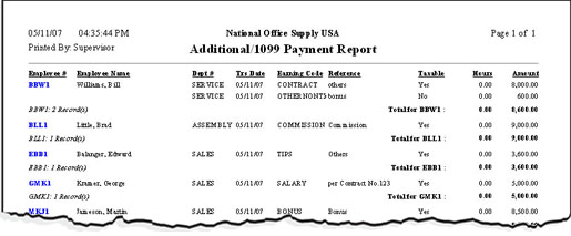 If you need detailed information about additional items for payment to employees and 1099 services for payment to independent contractors, generate the Additional/1099 Payment Report. Prior to application of payroll, you can generate this report to review the accuracy of additional/1099 payments recorded in the Additional/1099 Payment function.