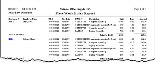 The Piece Work Entry Report generates information about completed piece work units recorded in the Time Card/Piece Work function. Using this report, you can verify the propriety of piece work entries prior to application of payroll.