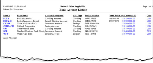 The Bank Account Listing shows detailed information about the bank accounts including each bank account's ID and description, account type, account number, bank routing number, GL account IDs assigned to each bank, and currency used for the transactions using this bank account. The bank accounts are set up in the Bank Account Maintenance function. This report is useful in reviewing the completeness of the bank account records set up in AccountMate and verifying the accuracy of each bank account's assigned GL Account IDs.
