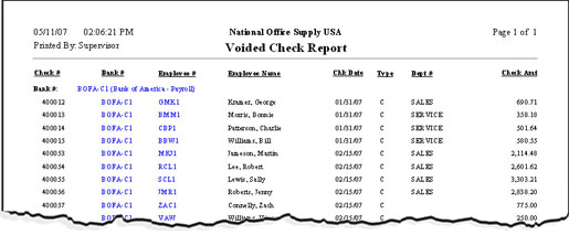 The Voided Check Report provides information on both payroll and tax deposit checks voided through the Void Payroll Check and Void Tax Deposit Check functions. Use this report alongside the Check Register Report to assess the completeness of the checks recorded in AccountMate and to determine which checks are reprinted. You can also verify whether the checks listed in this report match the actual voided checks in your possession. When reconciling bank accounts and book balances, you can use this report as reference.