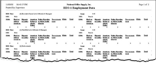 If you need equal employment opportunity data for the entire company, generate the EEO-1 Employment Data report (a.k.a. Employer Information Report). This report displays the number of employees assigned with a certain EEO class and ethnic code. You can use this report together with the EEO Report to review the statistics of the employees' EEO classes and/or ethnic codes. This report is available if the EEO Reporting State/Local Government checkbox is unmarked in PR Module Setup's General (2) tab.
