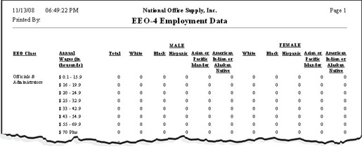 The EEO-4 Employment Data report (a.k.a. State and Local Government Report) is specific for the EEO-4 survey participants. The report shows a different set of EEO Class and Ethnic Code options than those used in the EEO-1 Report. This report also provides Equal Employment Opportunity data for the entire company. You can generate this report if you mark the EEO Reporting State/Local Government checkbox in PR Module Setup's General (2) tab.