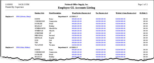 The Employee GL Accounts Listing report shows the GL Account IDs and distribution percentage for each employee and/or independent contractor's wage/service costs and the related employer payroll tax costs. For employee records, this report shows one or more pairs of GL Account IDs for employee earnings and payroll tax. For independent contractors, the report shows one or more pairs of GL Account IDs for the independent contractors' earnings only. Use this report to review the GL Account IDs assigned to wage/service expense and tax expense of each employee or independent contractor and to verify the percentage of distribution assigned to the GL Account IDs set up for each employee record.