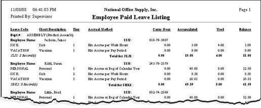 The Employee Paid Leave Listing provides information about the parameters set up for each paid leave code assigned to each employee. It presents not only the paid leave balance for each employee but also the paid leave hours that have been carried over, accumulated, and used in the current tax year. This report is most helpful when you verify the propriety of paid leave codes assigned to each employee and the accuracy of the paid leave balances.
