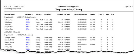 Generate the Employee Salary Listing if you need to know each employee's salary information including the pay type, pay period, pay rate, weekly regular hours, and dates of performance and salary review. This report also tells you whether the employee is entitled to overtime and tips and is set up for electronic payment. This report helps you review each employee's salary/wage information and track the next performance and salary review schedule.