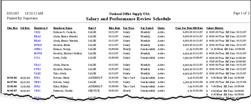 When it is time for performance appraisal and salary reviews, the Salary and Performance Review Schedule comes in handy. This report displays not only the dates for the next performance appraisal and salary review for each employee but also the hire date, pay type, pay period, current pay rate and effective date, and salary history. This report serves as a quick reference especially during employee regularization, regular performance appraisals, and promotions.
