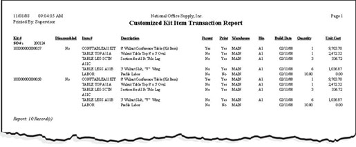 You can select to generate this report for built kits only, for disassembled kits only or both. You can also choose to generate this report for items with on-hand quantities only. You can further select to include in the report the kit item components, and item description, serial # and lot #.