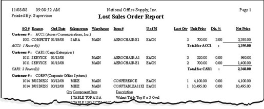 The Lost Sales Order report provides information on cancelled sales orders and sales quotes. You can use this report to review the performance of your Sales Department, taking into consideration the lost sales opportunities. This report also provides information on the causes of the sales order cancellations, which will help you formulate means to improve sales and avoid committing the same mistakes in the future.