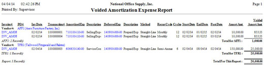 The Voided Amortization Expense Report generates a list of all deferred expense invoices and their corresponding amortized expense transactions that are voided.