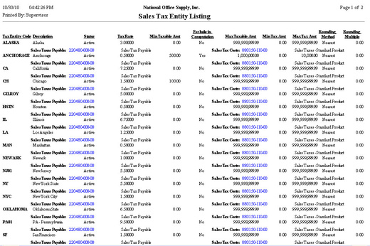 that are set up using the Sales Tax Code Maintenance function. This report is