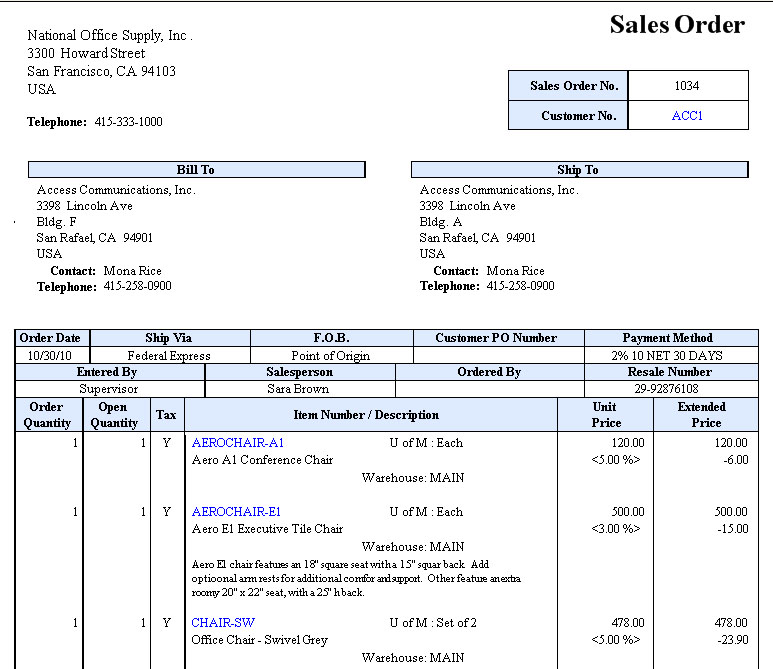 The Print Sales Order function allows you to preview and print sales orders, which show the specific inventory items ordered by customers. You can forward the Sales Orders to your customers as acknowledgement of their orders.