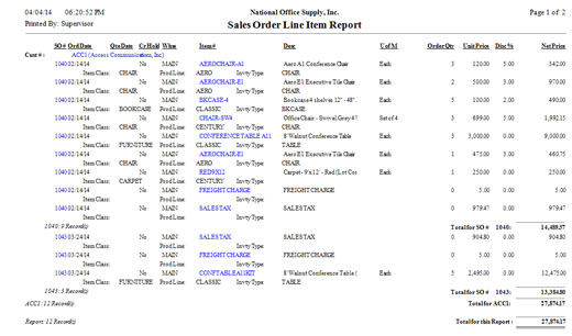 The Sales Order Line Item Report provides detailed information on each sales order or sales quote line items including the sales order numbers, customer numbers, order dates and source warehouses as well as the inventory items’ numbers, units of measurement, order quantities, unit prices, discount rates, and net prices. This report is useful in reviewing the correctness of sales order or quote information and in determining the inventory items that are saleable during a specified period.