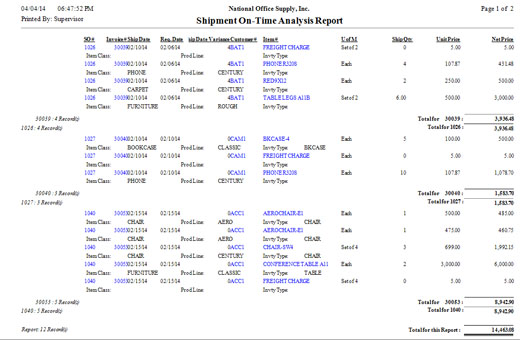 The Shipment On-Time Analysis Report provides information on the shipment lead time, which means the number of days it takes to ship a sales order from the date the order is placed. The Ship Date Variance column in the report displays the lead time in man-days. The information in this report provides data for analyzing the timeliness of sales order shipments. This report is useful in determining your efficiency in shipping sales orders on time.