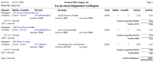 The Un-invoiced Shipment Cost Report shows information on the quantity and cost of confirmed shipped items which are not yet invoiced. The report helps you determine the inventory items that are accepted by the buyer but are not yet billed.