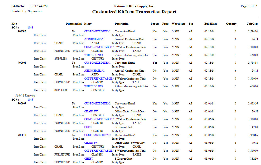 The Customized Kit Item Report lists all the kit inventory items that were built using the Build Customized Kit Item function. This report helps you identify the sales orders that include customized kit items and monitor the amount of customized kits.