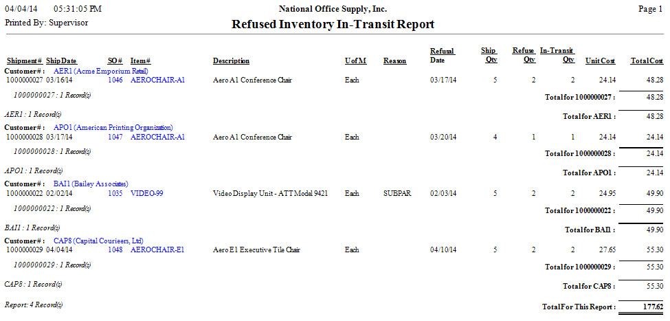 The Refused Inventory In-Transit Report provides information on previously shipped items that were refused and returned by the customer. These refused and returned items form part of the items’ in-transit quantity. This report is useful for monitoring and tracking the quantity and cost of refused items that are still in-transit.