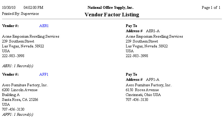 The Vendor Additional Address Listing shows additional vendor addresses other than the main address shown in the vendor record -> Information tab. These additional vendor addresses are set up in the Vendor Address Maintenance window. This report supplements the vendor contact information in the Vendor Listing. You can filter the report to display additional addresses of only the active