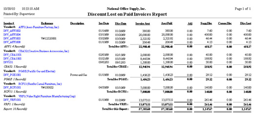 This report is useful in reviewing how much discount you could have saved from fully paid AP invoices if payments were made within the discount period. In addition to this report, use the Discount Taken Report and the Discount Lost on Open Invoices Report to help you assess your overall effectiveness in taking advantage of prompt payment discounts.
