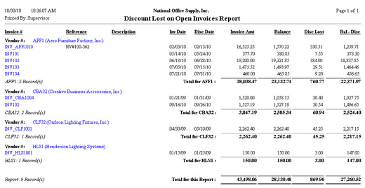 The Discount Lost on Open Invoices Report generates a list of outstanding invoices, as of a certain date, for which the discount period has already lapsed. This report is useful in reviewing how much discount you could have saved if the outstanding AP invoices were fully paid within the discount period. Use this report and the Discount Taken Report to help you assess your overall effectiveness in taking advantage of early-payment discounts.