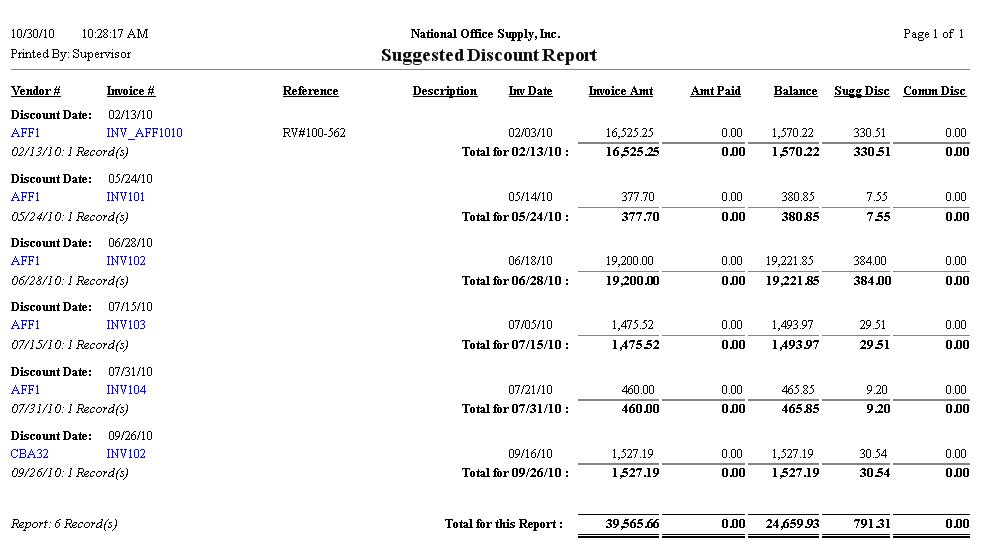 The Suggested Discount Report lists all invoices that qualify for early payment discount as of the given report date. The system-calculated suggested discount amount is based upon the terms entered in the AP Invoice Transactions and Recurring Invoice Setup functions. This report is useful in determining the invoices that are qualified for early-payment discounts as of a given date and in effectively managing the cash outflows.