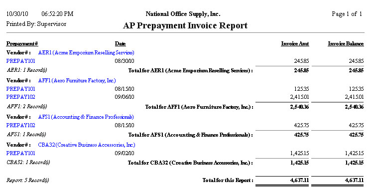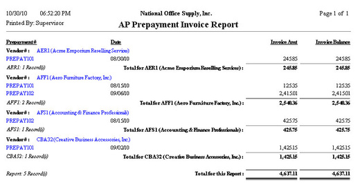 The AP Prepayment Invoice Report provides information on prepayment invoices that are posted using the AP Prepayment Transactions function. This report shows the prepayment invoice number and vendor number as well as the prepayment invoice amount and balance. This report is useful for reviewing and monitoring the outstanding balances of prepayment invoices.