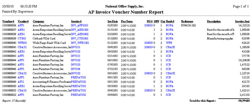 The AP Invoice Voucher # Report shows all voucher numbers that are automatically generated upon posting of an invoice, except for voided and purged invoices. This report can be used as a reference to counter check internal control using voucher numbers.
