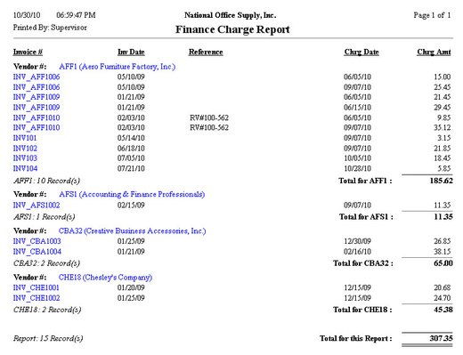 The Finance Charge Report provides information on the vendor-assessed finance charges applied to delinquent or past due invoices. This report allows you to assess the current status of finance charges applied to AP invoices. This report also helps you determine and reconcile the finance charge expense account balance.