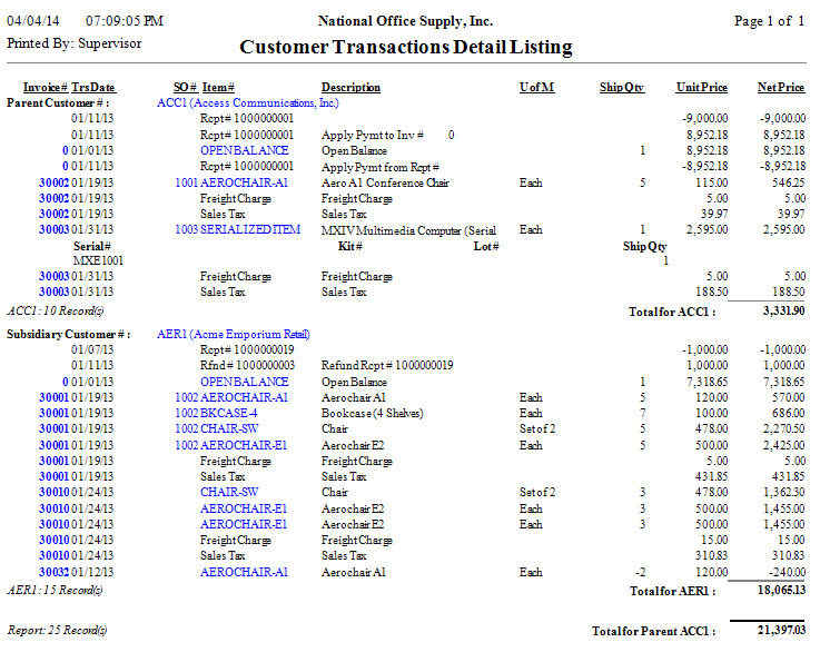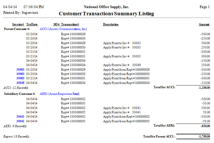 payment transactions, or for all customer transactions. You can further elect to include voided invoices and voided payments in the report. You also have the option to generate a consolidated report for the subsidiary accounts and their designated parent account. This option is applicable only when you are generating the report for an individual customer.