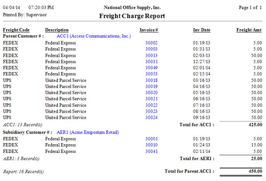 The Freight Code Listing shows detailed information on the freight codes set up using the Freight Code Maintenance function. It lists all the freight codes and their related information including the freight description, shipment weight limits if the freight charge is calculated by weight, freight charge per weight rage, and minimum freight amounts. This report is useful in reviewing the accuracy of the freight code records. This report also serves as reference when applying freight charges to invoices and when updating the freight charges.