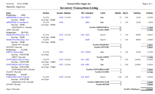 You have options to show in the report the inventory items’ serial numbers, lot numbers, and kit numbers, if any. If you generate this report from the Sales Order, Accounts Receivable, Purchase Order or Manufacturing module, you can filter the report to show only the inventory adjustments recorded in each of those modules or in all modules. If you generate this report from the Inventory Control module, you can filter the report to show the inventory adjustments recorded in the Inventory Control module only, in the Accounts Receivable/Sales Order module only, in the Purchase Order module only, in the Manufacturing module only, in the Return Authorization module only or in all modules.
