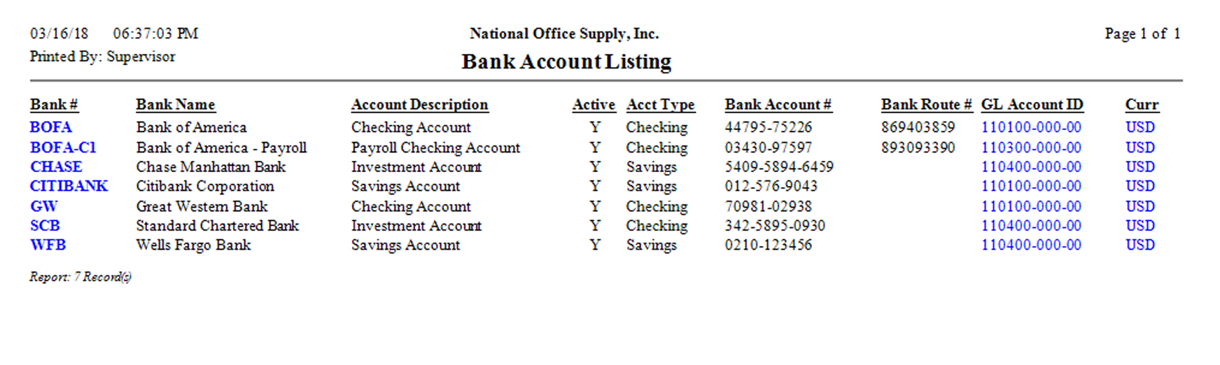 Payroll, in Sales Order and Accounts Receivables, or all bank accounts. You can generate this report for active banks only, inactive banks only or all bank accounts. You can