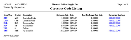 Dealing with foreign companies will inevitably make you transact in foreign currencies. AccountMate accommodates customer transactions in foreign currency by using currency codes. The Currency Code Listing provides information on each currency codes including its symbol description, current exchange rate, and the posting GL Account IDs for the foreign exchange gains/losses. The currency codes are set up using the Currency Code Maintenance function. This report can be used to determine the accuracy of the foreign exchange gain/loss GL Account IDs assigned to each currency code and to ensure up-to-date exchange rates.