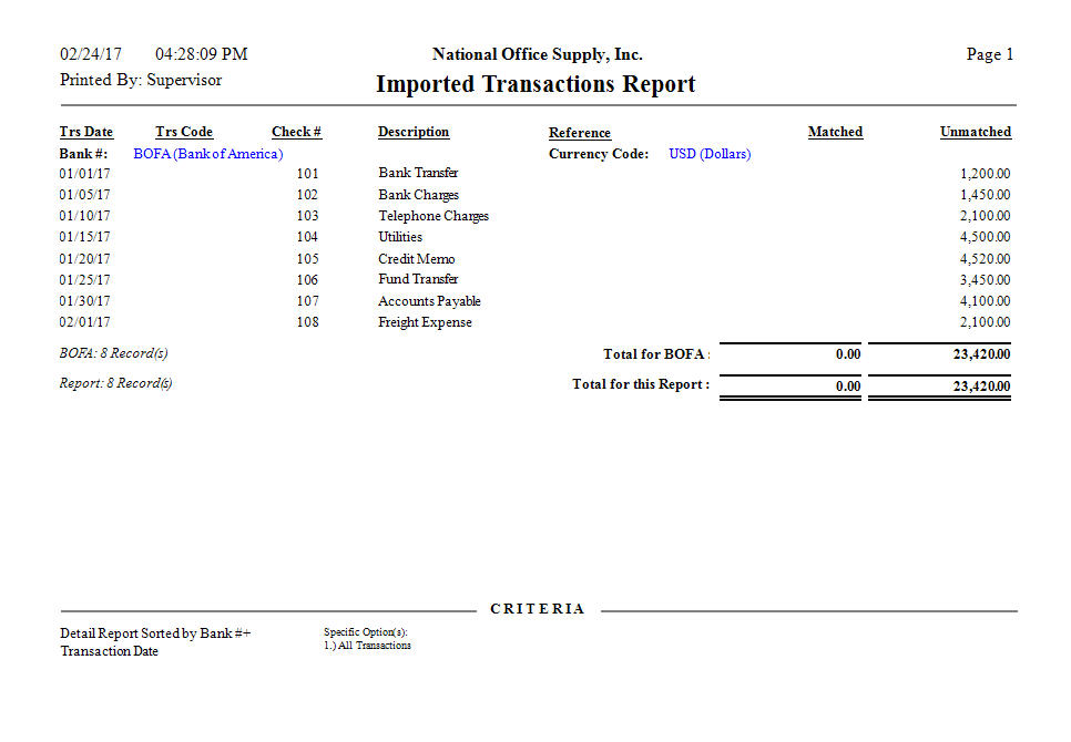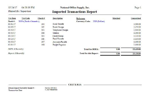 You can generate this report for matched transactions only, unmatched transactions only, or all transactions. You can also select to display in this report the recorded transactions that match the imported transactions.