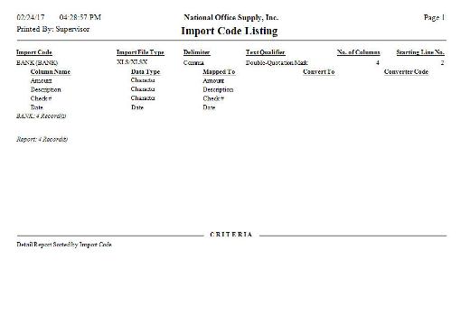 The Converter Code Listing provides detailed information about the converter codes set up in the Import Bank Data Converter function. This report is useful in reviewing the completeness of the recorded converter codes and the accuracy of the converter code records.