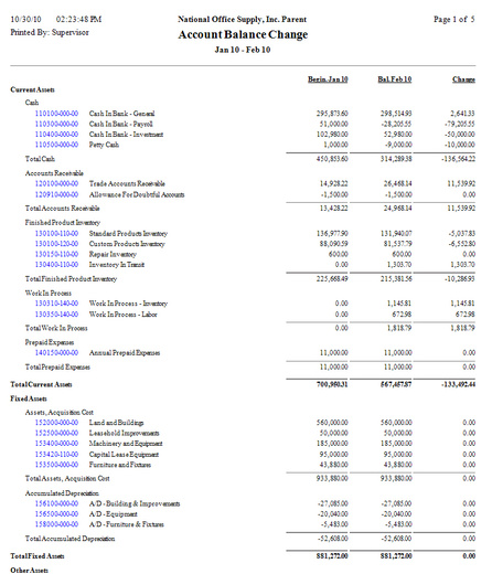 The Account Balance Report provides information on the GL Account ID balances either for each period or a range of periods. The year-to-date Account Balance report displays each GL Account ID’s cumulative balance at the end of every selected period while the period-to-date report displays the GL account ID’s balance for each period only. This report is useful for analyzing accounts for consistency, detecting pattern of changes for each GL account balance over a period and as a reference in preparing periodic forecasts.