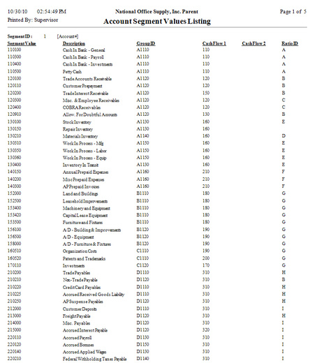 The Account Segment Values Listing provides information on the account segment values set up for each account segment type. It lists the account segment types and values as well as each account segment value’s assigned group ID, cash flow categories, and ratio group. This report is useful for reviewing the correctness of the account segment values and determining the propriety of the cash flow category and ratio group assigned to each segment value.