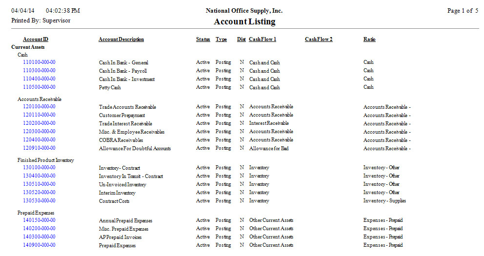 The Account Listing report provides information on an updated list of your company’s GL Account IDs as of the report date and gives the details of each GL Account ID. This report is useful for checking completeness of each GL Account ID and tracking of any modifications made. It can also be used as reference for posting transactions to appropriate GL Account IDs.
