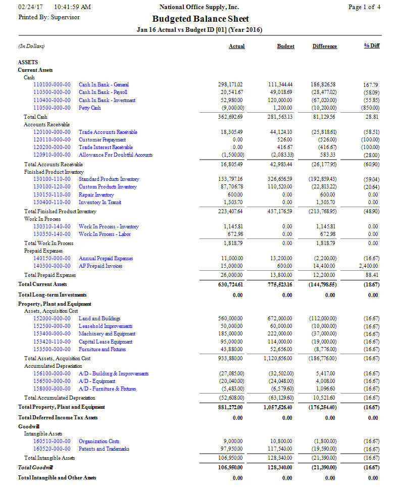 The Budgeted Balance Sheet provides information on the comparison between the actual and budgeted amounts for a single period or range of periods based on a predefined budget. This report is useful in assessing actual against the budgeted amounts, and in monitoring and updating your company’s budget.