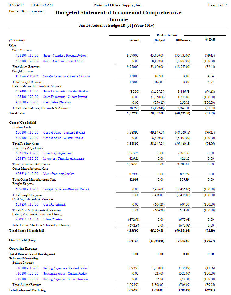 The Budgeted Income Statement provides information on the comparison between the actual and budgeted amounts for a single period or range of periods based on a predefined budget. This report is useful in assessing actual operations expenses against the budgeted amounts, and in monitoring and updating your company’s budget.