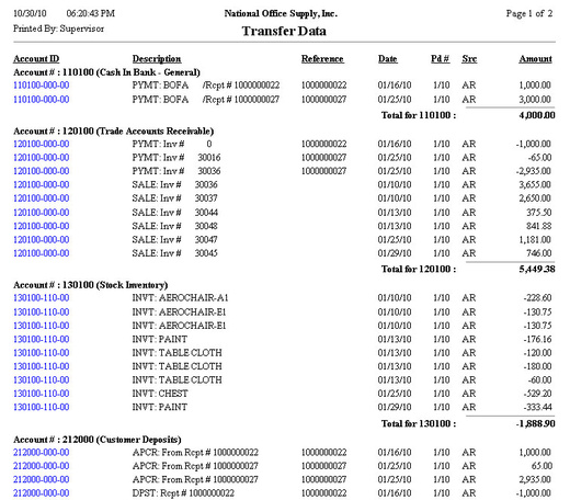 The Transfer Data report provides information on all transactions transferred to the General Ledger from the various integrated subsidiary modules. This report includes all the transactions transferred to the General Ledger when performing period-end closing and transfer data to GL in the subsidiary modules. This report provides an audit trail and must be printed prior to closing the fiscal year in the General Ledger. This report is useful for verifying the completeness of the transferred data from the subsidiary modules to the General Ledger, and serves as reference for determining the source module and the transactions’ posting periods.