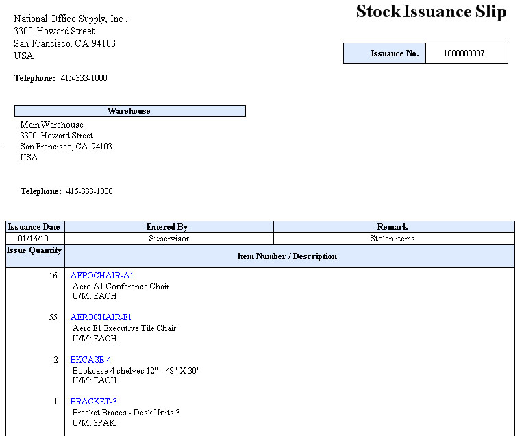 The Print Stock Issuance Slip function allows you to print the internal stock