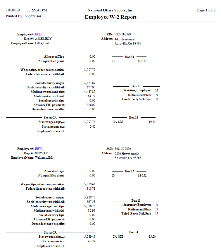 Prior to printing W-2 forms, you need to review the employees' W-2 information. You can facilitate the review by generating the W-2 Report. This report displays the employees' earnings and the federal, state, and/or local tax withholdings. If the employee has earnings or taxes in multiple states, the report shows the earnings and taxes separately for each state.